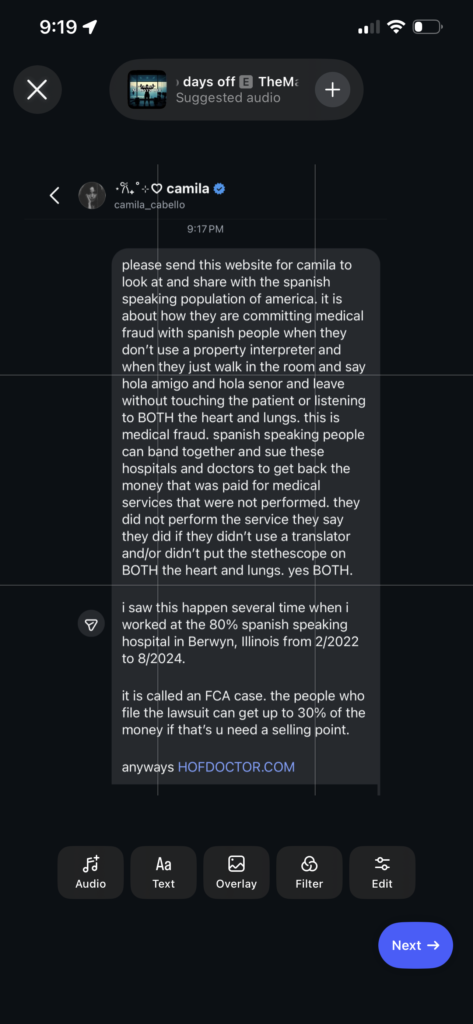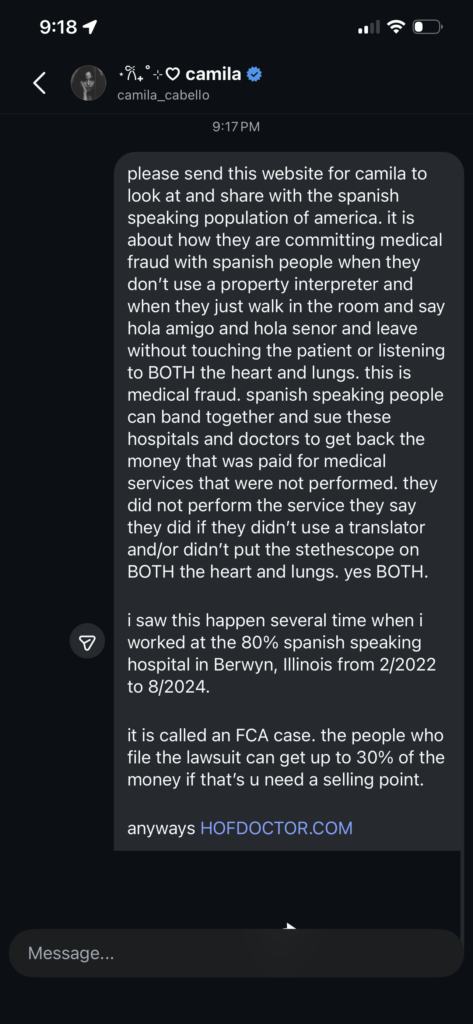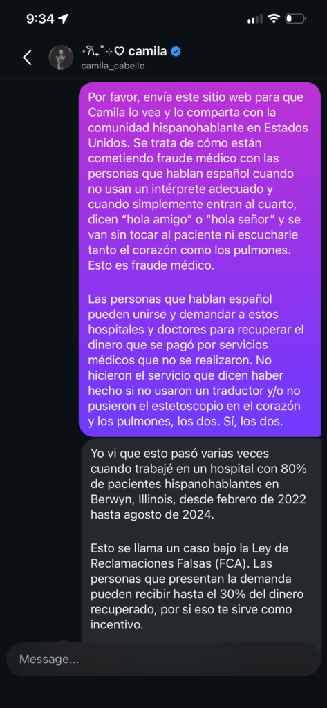Por favor, envía este sitio web para que Camila lo vea y lo comparta con la comunidad hispanohablante en Estados Unidos. Se trata de cómo están cometiendo fraude médico con las personas que hablan español cuando no usan un intérprete adecuado y cuando simplemente entran al cuarto, dicen “hola amigo” o “hola señor” y se van sin tocar al paciente ni escucharle tanto el corazón como los pulmones. Esto es fraude médico.